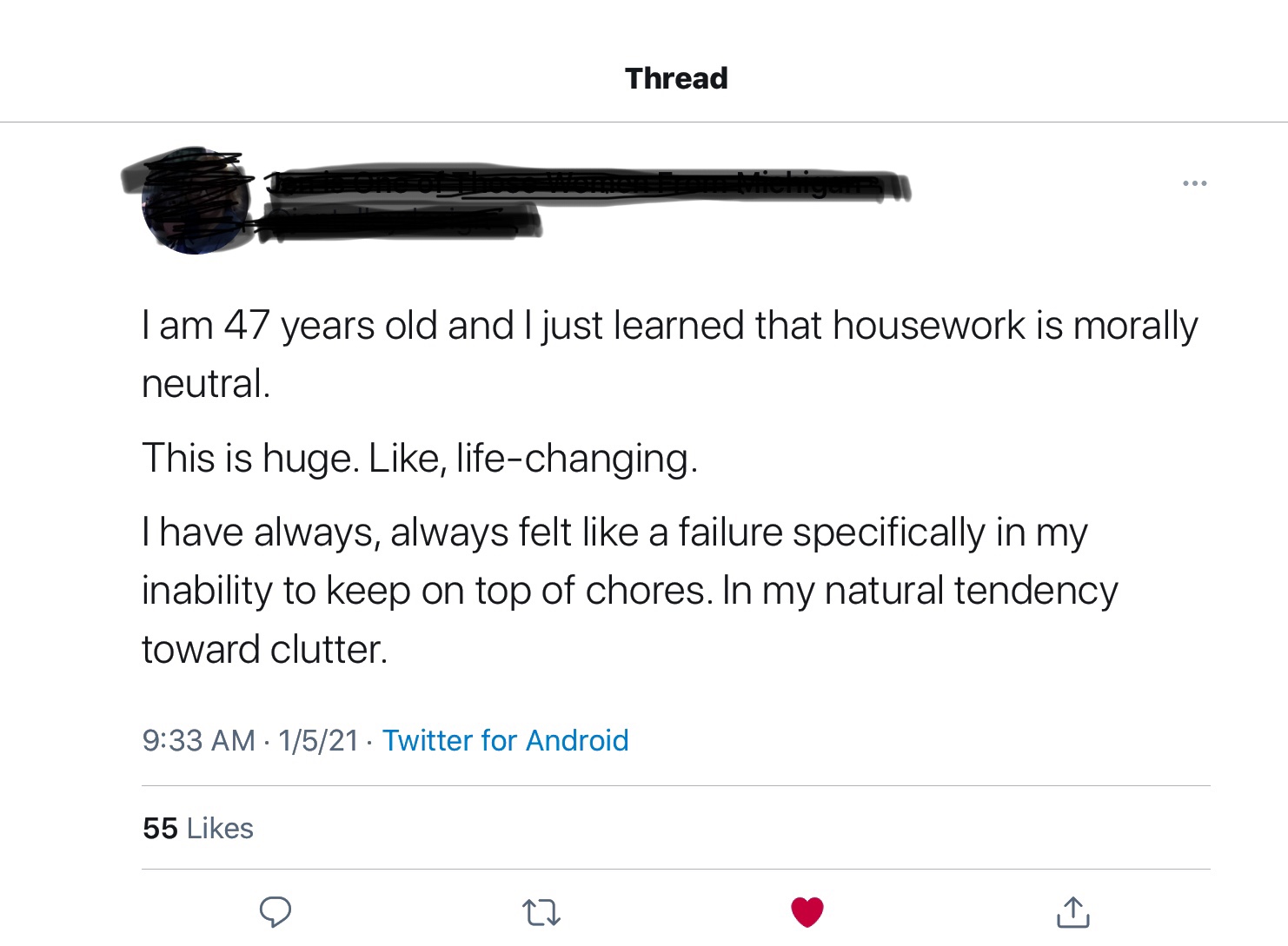 I believe deeply in letting go of shame*, especially when it comes to house work. There are a lot of reasons why house keeping can get away from you and putting a lot of shame on yourself about it is unnecessary and counter productive. I know this deeply and truly about other people. It is much much harder to apply those beliefs to myself. A couple of days ago I saw this tweet: