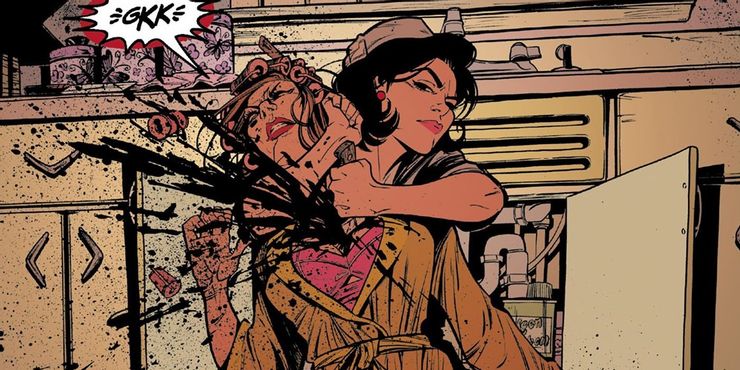 I don’t believe I’ve ever met another heroine like Josie. Certainly most killers in television and movies are men, but even when killers are women, they are typically more noble in their pursuits: wronged females fighting for revenge, or strong ones pursuing justice for others. Very few female characters kill simply for money; very few are as violently efficient. Indeed, in the first few pages of volume 1, even though I knew the series was about a female assassin, at the moment of the murder, I involuntarily thought, “Wow, she’s really killing that poor hag.” Even Josie’s choice of weapons skews toward the savage. She stabs, she strangles, she bashes, as opposed to killing with a gun, which can be executed from a distance. Her physicality is part of her identity, and most encounters leave her covered in blood (one has to wonder how she has time to get all those blood stains out).