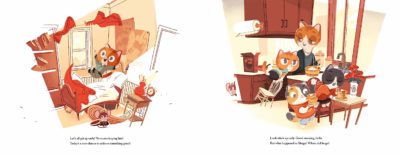 Now what leads to opening the book and reading about a cat waking up early and ready to go. Mama Cat says I guess Sleepy is no longer around and the little cat says that yes, Sleepy the Mouse is gone. But they, along with their siblings and friends, decide to go find Sleepy. They are going to get Sleepy. Cue obvious pun that might go over the kid’s heads, but adults, get ready to groan with the horribleness of this clever and fun pun. The cats in question head out on adventure a few pages are bare, little in the way of details, then it hits like a ton of bricks! The messy, detailed, wonderful Find Sleepy Page happens. We find ourselves in space, with dinosaurs, on the beach and many more places. You can find Sleepy on each page and while looking, see all the wonderful and silly things the cats are up too as well. And in the end, maybe they do not catch Sleepy, but you know they are going to catch sleepy.