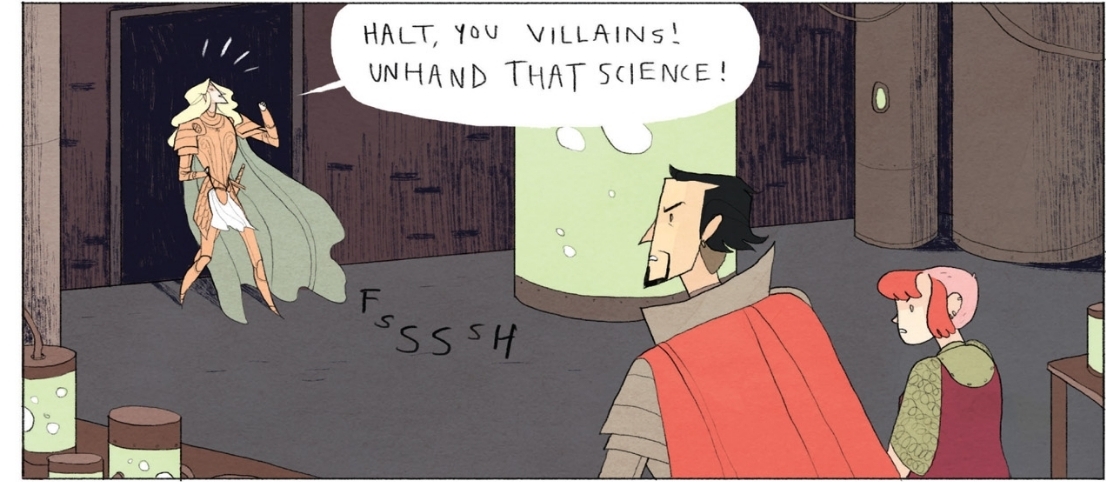 The setting of Nimona isn’t actually too far divorced from what we see in She-Ra: rather high fantasy on the surface, with a lot of nerdy science and magi-tech elements scattered throughout. We have heroic and villainous knights in shining armour with jousting sticks but said knights also have high-tech research labs where they develop secrete weapons, watch televised broadcasts and order pizza. Which they can then stash in the fridge for later. Things continue in the same vein outside the labs as well, with medieval markets paired alongside modern banking institutions. And dragons.