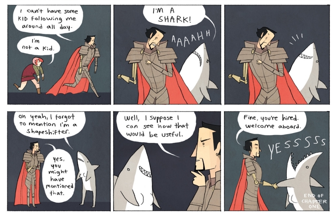The early parts of the comic play out with Blackheart and Nimona as the antiheroes cheerfully taking down The Man. And you can really get behind it, with Blackheart acting as the straight man to Nimona’s cheeky-ness, all drawn out in a vibrant, energetic style. And emotionally, it hits all the high notes, with Nimona and Blackheart adopting a sort of foster-child-parent type of relationship.