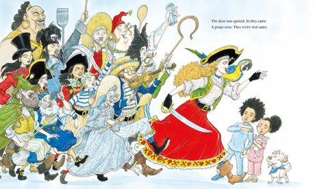 This should be a fun little tale of pirates, flying ships, doughnut feasts and magical stew but it falls flat. For me, the real problem of this book was Neil Gaiman’s rhyming text. It did nothing to hold my attention, and worst sin of all had me thinking of other options for the couplets. It lacked patterns and had a strange rhythm. I think I know what Gaiman was after (pirates are an unruly bunch after all) but it had me itching to skim. The good news? The illustrations by Chris Riddell are very engaging.