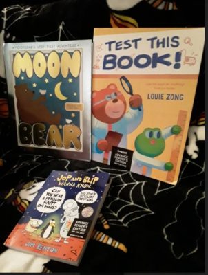 Test This Book!: A Laugh-Out-Loud Picture Book about Experiments and Science! has a title is almost longer than the book. The basic idea is there are two scientists (a bear and a frog), and they are teaching you how to do experiments. They use a book (in fact the book you are holding) as the example. You need to see if you can shake a book and then you see what happens and record it. Also, other tests such as what happens if you sit on the book (and so on) are used. Some things are humorous but overall, I did not find anything overly funny.