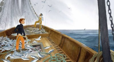 But I was just mostly looking at the illustrations and not trying to read them. The colors and lines are like the ocean. They are watercolors that just pop off the page. They are the ocean, people, and animals. There are variations of blues all over. The cover tells you all you will need to know. You see the main characters (man and whale). You see the colors and the way things are both romantic and realistic at once. They are both powerful and soothing illustrations with the right number of “things” added (such as the right details and colors).