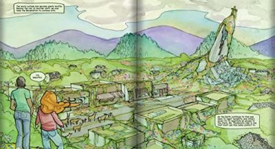 Nick Tapalansky imagines, and Kate Glasheen illustrates, what Earth will be like in the slightly distant future. What happens when Earth does a hiccup and lets a piece of reality float away? Or more accurately lets humans float away? People either adapt, a few take their lives and all cling onto something desperately. Whether it is the past, present, the future or a tether to the ground, life goes on. Glasheen’s has illustrations that both are ugly and lovely. My favorite part is when two characters are fighting and the sheer anger erupts off their faces. UPCOMING SPOILER: My second favorite is when two other characters find a not so empty house, and the “grave” that was created around a skeleton. The representation of the story, themes and these people is beyond powerful.
