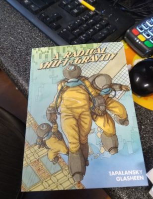 This whacked-out beautiful piece of art is a testament to the fact we can have something for everyone and everyone for something. This graphic novel named A Radical Shift of Gravity boils down to one small but oh so important theme: Humanity’s struggle to survive. It is gorgeously done, and captures the cycle of life, death, and a combination of the two. Everything unfolds on the pages with style. It is organized and chaotic all at once. The story flows, but is constantly jumping between then, now, tomorrow, and sometimes all at once.