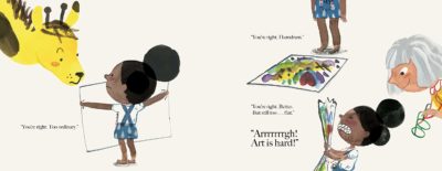 Yasmeen Ismail’s illustrations fit the theme and tone of Jim Averbeck but will not always be a plus for all people. They are subjective due to the cartoon-like imagery, formatting, and coloring. The family is a highlight of the book as they are modern without being pushy about the fact the family is mixed race.