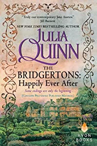 Of the nine stories in here, I was really only looking for about half of them after I had finished the books. Benedict’s epilogue about Posy was a delightful surprise, and Hyacinth’s was a nice continuation of the original ending. Francesca’s epilogue is the one I feel should have been included in the original story. Violet’s story could have been included in Anthony’s original book, or Daphne’s for that matter, or I suppose Gregory’s even. But it’s good that it’s finally somewhere. And Colin’s epilogue could have taken place during or after Eloise’s book. I could have gone without the second epilogues for Daphne, Anthony, Eloise, and Gregory though. I mean, they were nice enough, but I wasn’t looking for the information they provided. (Edit: after reading The Duke and I, this epilogue was fine, I guess, and mildly interesting.) And the second epilogue to Gregory’s story doesn’t appear to agree with the first one, but maybe that’s just me.