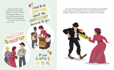 Who was Perkins? She was a woman of privilege who questioned things. She not only questioned, but she went out and did things to try and change the injustices she felt where there. And eventually, she had the ear of the most important man in the country at the time, President Franklin Delano Roosevelt. She would be the first woman in several historical ways, such as not only was she was the first women as a Secretary of Labor but the first woman to serve in a presidential cabinet. History unfolds with Krull’s text and Alexandra Bye’s illustrations.