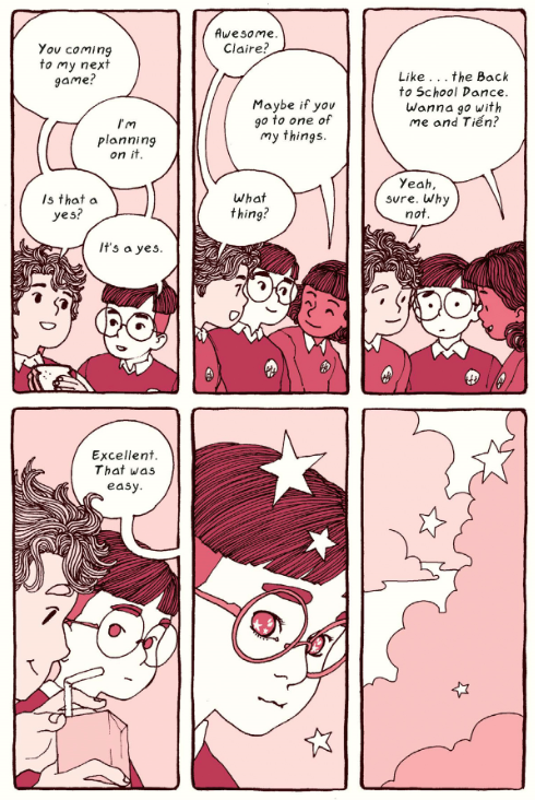 And they connect neatly to the contemporary* stories of its two main characters. Tiên and his mother have a lovely, pure connection not only through stories but through their daily interactions. The middle school friendships are adorable and I just love how the author/artist illustrates Tiên’s crush on Julian. We also see flashes back to his mother’s past, trying to emigrate after the war, and her journey back home when a loved one passes. Different hues portray the three timelines.
