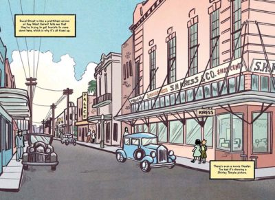 Turtle in Paradise: The Graphic Novel is based on Jennifer L. Holm’s novel of the same name. We follow a spunky girl named Turtle as she comes of age in the late 1930’s when sent to live with family she has never met in Key West. The town her mother and aunt grew up in still has cousins, old friends, and Turtles not-so-dead grandmother still there. Turtle has been forced to be an adult before her time as her mom has her head in the clouds most of the time (dreams of a home for the two of them, maybe becoming a movie star, her salesman boyfriend is Prince Charming and someday will be providing for them) and Turtle knows that kids are not “sweet as necco wafers” (mostly since several boys hurt her cat Smokey by burning its tail). Yet, Turtle learns how to be a kid, that not all kids are bad (even if they are a bunch of boy cousins and their friends who call themselves The Diaper Gang) and what family is all about after some crazy events blow through her life (literally: Turtle and her new friends are trapped in the middle of a hurricane).