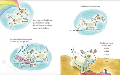 The illustrations of Young are classic them. Sparkle is that goat-like unicorn, Lucy a perky and happy young child. The colors are sweet, not overwhelming but not faded. And you know how much sparkle there is in Sparkle’s sparkle droppings!
