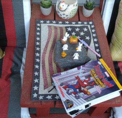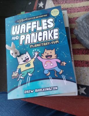 Finally, as things started to get a bit on the darker side (I was reading on the porch, sitting on the billion-year-old “double love seat” with last year’s new cushions on it) Waffles and Pancake: Planetary-YUM by Drew Brockington closed out the reading. This is a cute graphic novel with facts about space and furballs, is based on another series were our hero Waffles stars, CatStonauts. The flow can be awkward for adult readers but ages 6 up will be fine. Its tone is that of a child as Waffles and his sister Pancake take us through the museum with their Dad-Cat. Cat puns pepper the pages as the moon, space and star-tots take center stage. Their adventures continue when they get lost from their father and worry that they will have to live in the museum on tuna-melts and furever. Of course, there is a message here (as an adult in charge to help you). Brockington’s background of being a member of NASA (at Space Camp) comes full center and their ablaiities to create simple but not simplistic, not diluted but quiet color illustrations. Details are basic, but what is there guides the reader around.