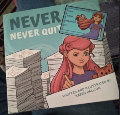 Karen Hallion is one of the best illustrators I have found in the last few years. Her art is sweet, funny and can make pop culture educational as well as entertaining. You can follow them on Twitter, Facebook, and other social media sites. They have a handful of sites where you can buy their work. I found Never, Never Quit on her Etsy page, so it might not be the easiest find, but worth it.