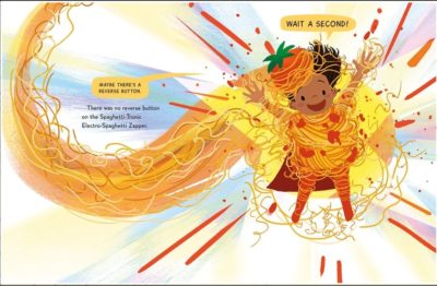 At first, I thought Super Spaghetti was going to be about a picky eater. Nope. Then thought that it might be a “Big Anthony” in Strega Nona type of story. Nope. Then I said, WHAAAAAAAAAAAAAAAT? as our main character, Fred, gets engulfed in spaghetti and turns into a superhero.