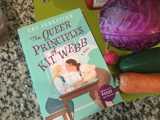 A few weeks ago someone on twitter asked if anyone ever actually won those Goodreads giveaways, and yes, people do win Goodreads giveaways. I won a physical copy of Cat Sebastian’s The Queer Principles of Kit Webb. It arrived on my doorstep just as I had pulled out some color complimentary veggies. Look at me being a bookstagramer.