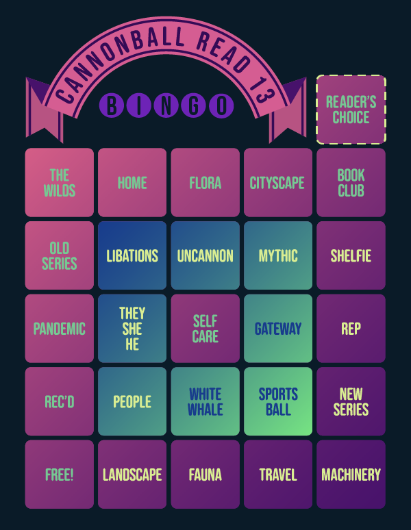Welcome to the 2021 Book Bingo Reading Challenge! Select five squares across, down, diagonally, or 5-up (four corners + center square), and get an entry into a drawing for some cool prizes. This year we have a special Ring Bingo – complete the ring of 8 blue-green squares for an additional entry. Complete the entire card – a blackout! – and get 16 entries into our drawing. Download your game card below, and post your reviews tagged with cbr13bingo for chances in our prize raffle. You can ask questions, ask for suggestions in the comments below and in the monthly check-in posts. You can also ask for suggested books and clarifications in the comments here, the check-in posts, and in the Facebook group Cannonball Read Book Chat.