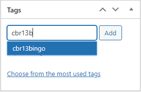 The cbr13bingo tag in the Tags box in Edit Post. The CBR13 Book Bingo Reading Challenge begins on Thursday, July 1, 2021 and ends at 11:59 p.m. EST on Sunday, October 31, 2021. Only books that have reviews posted during this time period count towards completing a bingo. You can begin the reading challenge at any time during this period.
