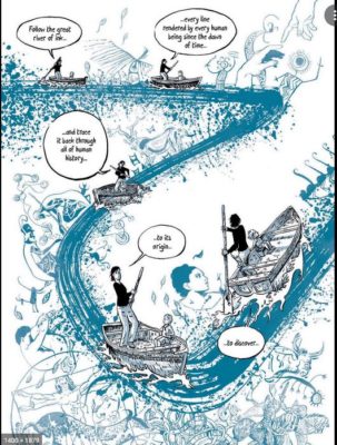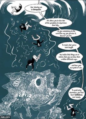 The author starts his graphic novel with the seemingly innocent question of a child, “Why do you draw?” And instead of telling him a simple answer, we are subjected to a trip through time and space. We see the first person who drew. We see war. We see love. We see madness. We are taken on a lofty, arty mind trip through the inspirations and the whys of art, of drawing.