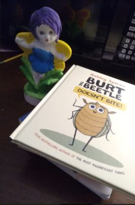 Burt the Beetle Doesn’t Bite! is a cute “first read” about beetles and insects. Ashley Spires created a simple, but also includes information, fiction story. The fiction/story aspect allows it to not be an “all-encompassing fact filled book” that bogs you down. It just tells you a story as they introduce the different creatures in the book. The story is about the talents the characters have, that we all have, that might not seem great at first, but there is a place for them at the right time. Of course, there is kid humor, but it does not go into gross or into “not parent friendly” territory. It is clever, thoughtful, and there to move the story onto the fun, silly and educational ending.