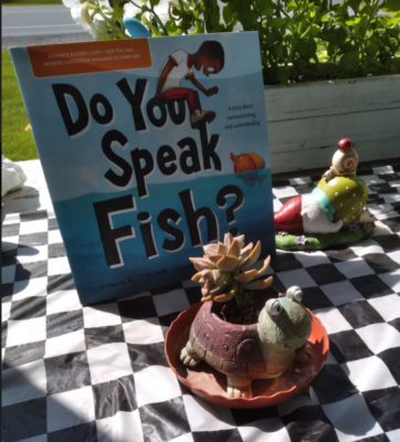 Do You Speak Fish? is a book about communication. The best way to describe this is, when I posted the picture on my Facebook page, my sister replied, “No, but I speak 24.” (We call her sons/my nephews by their ages on social media). And that is true. Trying to understand him without knowing his language can be tough. He is autistic and deaf in one ear. This little guy (he’s under 6 feet, but I still see that not five-pound baby) speaks his own language. And when you read Do You Speak Fish? you realize that not everyone speaks your language.