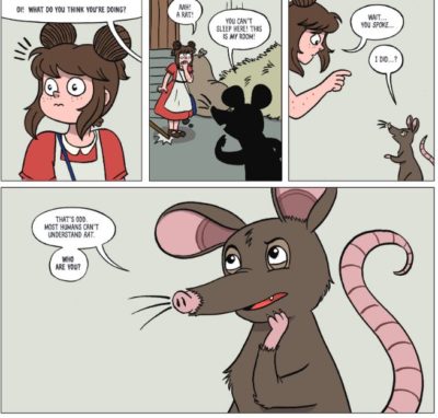 If Kiki the Witch and Harry Potter combined, you’d probably get the graphic novel, Queen’s Favorite Witch V01 The Wheel of Fortune. It has an old school feeling, but also modern sensibilities. There is obviously a European flare to the tone (as it is set in Elizabethan era) but accessible for all readers. It is not for those who are more sensitive, as there is an evil cult, a possible assassination attempt, death, and bullies. However, it is also seriously sweet and funny. Talking rats, quirky friendships, and historical people come to life in this new series by Benjamin Dickson.