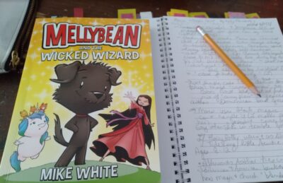 It was a shiny cover. It was a colorful cover. And it was a slippery cover. Mellybean and the Wicked Wizard seemed like a perfectly, fun, easy read I needed to clean my busy brain.