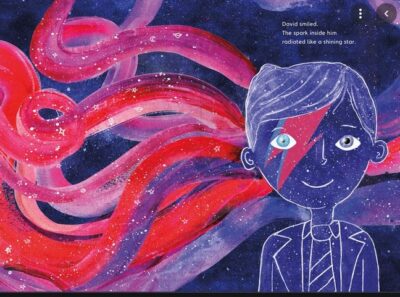 Of course, there are also facts about Bowie’s life as well. The lyrics and this information are woven into the story seamlessly as they are the building blocks of the actual message of this picture book.