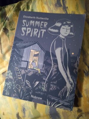Summer Spirit looked out from the top shelf. I am not sure how I saw it as my little over 5-foot frame does not usually see that far above my head! But once you learn the story, maybe you will think some supernatural events took place, making my eyes be drawn upwards. Or not. After all, ghosts are not real. No matter what Elizabeth Holleville says in their young adult graphic novel.