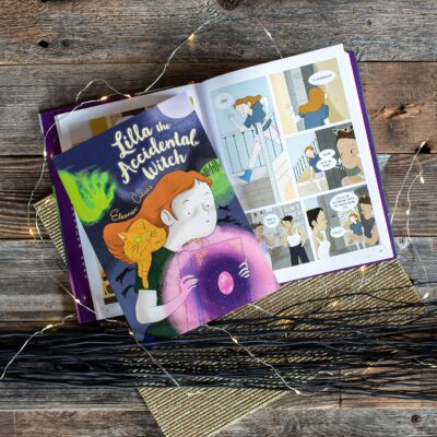 I can now say I have read all of Eleanor Crewes’ published books. All two of them. Unknown while reading, Lilla the Accidental Witch, I learned she is the author of The Times I Knew I was Gay. This time, the graphic novel is in a more traditional format and while based on some of her own life experiences, family home and their traditions, it is less “mature” but not childish. Lilla and her sister go to live with their aunt in Italy for several weeks, where Lilla learns she is a witch and the finds the courage to stand up for herself and tell her family what she really wants to say. There is much fun to have, a quick read for the adult and ages strong 8-9 (as there are some spookier elements dealing with a witch and spirit dogs trying to trick Lilla) to 12 will enjoy.