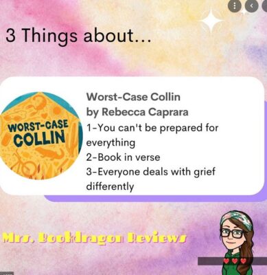 The prose poetry allows Worst-Case Collin by Rebecca Caprara to be a quick read, but without sacrificing the story. In the tone and style of Love that Dog and Hate that Cat, Caprara created a book that is both familiar in the subjects presented (growing up, bullies, the loss of a parent, friendship, mental health issues) and different (the father’s particular mental health issues). While I felt the ending was a bit forced, it also was the only way to do it. The realism of the resolution of Collin and the bully was refreshing. (SPOILER) They do not make friends with each other but do have a truce of sorts. Due to this, a book two could be possible.