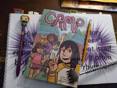 After you say, “a fun story of friends and summer camp” you have pretty much said it all about Click V02 Camp by Kayla Miller. I should add it is a graphic novel with the cover giving you pretty much all you need to know about the illustrations. They are colorful and funny. There is a diverse cast and the are at camp. I could also add that while there is a little excitement and a few “dramatic moments” occur, there is nothing edgy about the book at all. This is a book about being friends, speaking up for yourself and doing the right thing, even if it means that a friend might not like the results. Ages 8 to 12 (middle reader graphic novel)