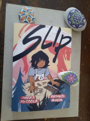 I have said it before and will say again, the perks of working in a bookstore rock. That biggest of all perks is the reading of a book well before it comes out. And y’all might have to wait until June for Slip by Marika McCoola (unless you can find a reader copy like I did) but you can read this review today (tomorrow and the next day, too). Not to mention that if you go to your local independent bookstore today you can preorder. Plus, if you place that preorder at my store or our sister store, you are helping a former coworker (from the sister store) of mine.