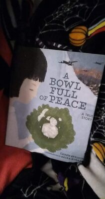 A Bowl Full of Peace: A True Story is a book that I can tell you: it is a beautiful book about survival, family, and beauty within the ugliness of war. A family heirloom survived the bombing of Nagasaki, but some of the family did not. This based on a true story testament to the why we should never let this happen again. Lovely illustrations accent and compliment the text. I can say that it is written by Caren Stelson and those lovely illustrations are done by Akira Kusaka.