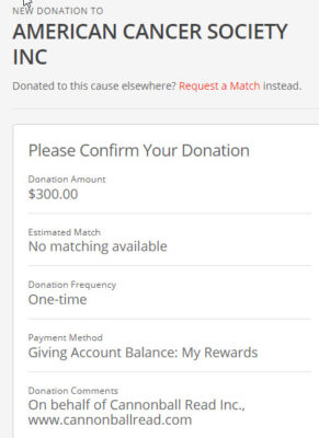 We heard from Bothari43 this week that her employer was offering giving dollars based on her volunteer hours with us. Because we’re a pending 501(c)(3), her volunteer work did qualify for an internal giving reward. But because we’re only pending, her donation had to go directly to the American Cancer Society.