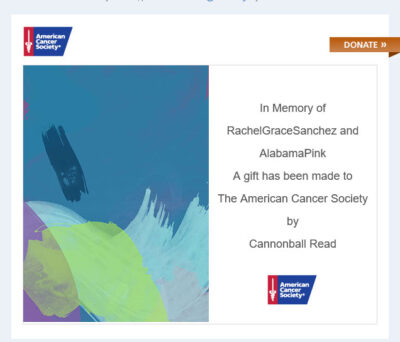 Thanks to our incredibly successful #GivingTuesday, we were able to match Bothari43’s donation with another $300 donation to the American Cancer Society this morning. With this donation, we remember AlabamaPink, and we also remember Cannonballer RachelGraceSanchez, who lost her life to cancer on December 1, 2021. Read a lovely tribute to Rachel by her dear friend, Sarah.