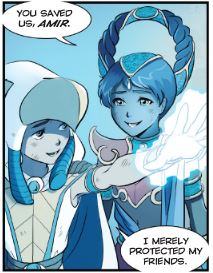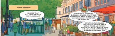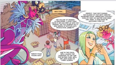 Aames, Don Most, Adam Rich, and Frank Welker as a unicorn called Uni). It also reminded me of She-Ra (a mix of modern and 1980’s) and of course, manga and anime. Seriously pop-off-the-page colors assault the eyes as the cover. This theme of boldness in the art (created by Philippe Ogaki) is throughout the graphic novel. Every panel and page are packed full, sometimes even to distraction. It sets the tone but may not always be fun to read if you want a quicker read.