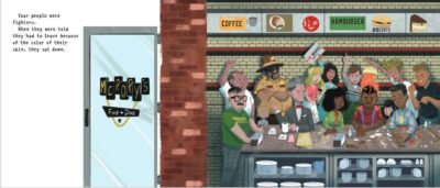 The place the characters are from are from a long line of people who fought, struggled, quietly sat instead of using violence, and had voices that spoke out. Images of Dr. Martin Luther King, Jr. and Maya Angelou are side-by-side of the people who sat because they wanted to eat lunch at a counter, but instead suffered humiliation.