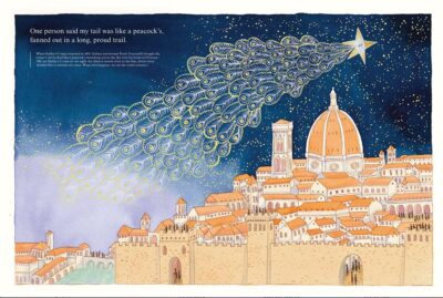 With gorgeously illustrated artwork by Yaara Eshet, this book tells you the highlights of the comet and the history even of the world. The images are busy and bold, and filled with text, colors, details and each page is filled with tons of wonderful goodness. The science and history of the comet and the world comes together seamlessly.