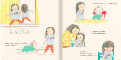 Fun illustrations Hyewon Yum that have a surprise if you look out for it, that helps show and tell how our heroine feels. These illustrations are simple but have fun details. The surprise had to be pointed out to me in the authors afterwards, but once I saw it, I had to go back and find it. And it is the perfect metaphor/example of what is happening to Katie and how she is not really dealing with her emotions. The colors were bold, and not necessarily overly “too much” and are geared towards a younger crowd. Of course, they are eye catching.