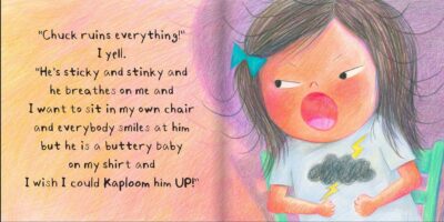 Katie Honors is a really nice kid, but in this realistic story about a young girl and her little brother Chuck, who seems to ruin everything he (literally) touches, Sometimes I Grumblesquinch (or more actually Katie does) it is hard to stay nice. Trying to stay the “good girl” after a not so fun morning, she pushes her feelings down (grumblesquinch) every time something happens that upsets her (Chuck takes her seat at the table, he gets food over her favorite shirt, he “punches” her food) until the anger/emotions finally pop out of her and more than a grumble erupts from Katie. What will her folks do? Will they still think her perfect? Will they love her as she is not perfect now?