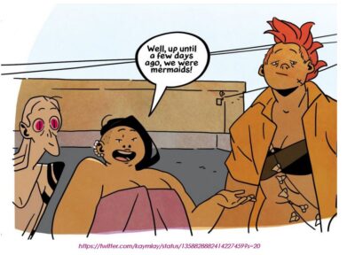 Three merfolk (all seem to present as female/her) love human floatie things. They (humans) just carelessly lose them in the deep. But hey! Finders’ keepers and one of the best finds is what comes in bottles. Those happy bottles that Eez can open within an air bubble. The happy liquid that makes them tipsy (okay fershnickered!) and make bad choices: like using Eez’s magic to turn them human so they can get more to drink.