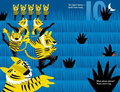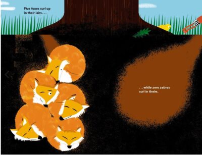 Bruce Goldstone starts with the usual counting format. Therefore, the idea of 5 foxes or 10 tigers is not new, and even zero zebras is not a new concept. However, one most likely will assumes that by the end you will have a menagerie of animals and then the narrator will say, oh one zebra or 100 zebras finally showed up. You expect something in the “number category” to end this picture book. Yet, this is a book that is about zero.