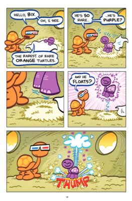 This story is cute, but not overly detailed. Gilbert and friends visit Sherbet’s island, where they meet all his siblings and new baby brother Bix (Because It eXists”), who is even more rare than Sherbet (who is orange with orange spots). Bix is such a rare orange turtle he is purple (yes, made lots of sense to me, too). There is a shark