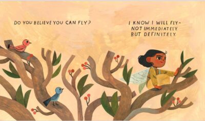 Before that, we follow a fictional Loujain, a child who dreams of colors and seeing sunflowers like her father can see. But to get there, she must fly, but only men can fly. Despite misgivings at first, Loujain’s father teaches her how to fly. And when she is found out, yes, people stare and think her wrong, but it inspires other girls to ask their fathers to buy them wings so they can learn to fly as well. Yet, as mentioned above, Al-Hathloul’s real life was less hopeful. But it does sound as if she and her family speak out where they can and try to keep that inspiration alive.