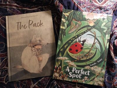 A surprise in the mail other day found its way to my desk. Two hardcover picture books from a publisher I do not remember asking for (but I am on publishers’ lists so it could be they cold-sent!) called The Pack by Amanda Cley and Cecilia Ferri and A Perfect Spot by Isabelle Simler.