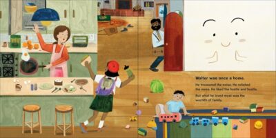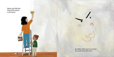 Walter is a home. Or Walter was a home in A Home Named Walter. Well, he still is a home, just after his beloved family has moved out, he allowed himself to get rowdy, squeaky, rundown and dried up. One day a new child and her mother move in. Not only does the girl think this new situation feels “off” and “different,” so does Walter. He does not allow them to bake cookies in the oven, or he will slam the shutters closed. But with love, and understanding, the little girl realizes that the house is sad too, and together she and her mom show how much they care, and Walter finally lets them fix him up better than new, as he is a real home again with the hustle and bustle of a new family.