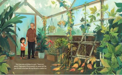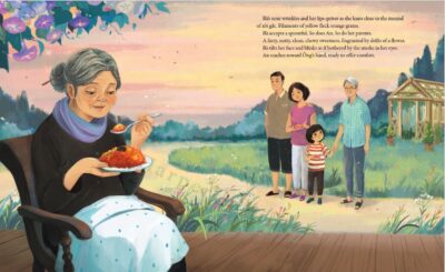 An (the child of the story) tells how they and their grandfather prepare from seeds to final dish, the favorite dish of the grandmothers at her wedding. We see the lights of recognition and the dark of the loss of memories. When An finally sees that light go off in her grandmother’s eyes, only to lose it again, the frustration An feels is raw and relatable.