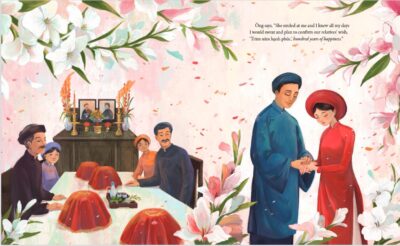Those real emotions and moments of the child and family come alive in Thanhha Lai’s text. And burst off the pages with the boldness of details and color in the illustrations of Nguyen Quang and Kim Lien. These images are gorgeous, busy, detailed, soft, and bold. They are just amazing.