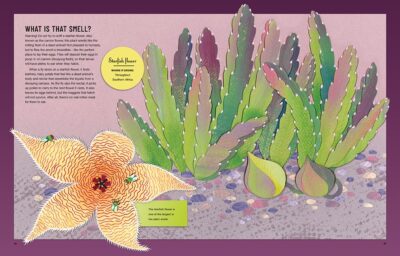 Each page is illustrated in an artistic manner by Ashley Barron. The text of Etta Kaner is interwoven around, in and through them. The text includes not only the tricky-trick used, but where the plant can be found and some additional facts.